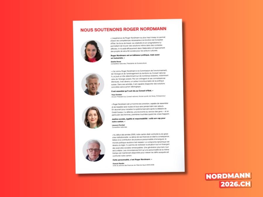 “Au début des années 2000, notre canton était confronté à une grave crise institutionnelle. La dérive de ses finances en était la conséquence. Grâce à la contribution de plusieurs personnalités d’envergure, le monde politique vaudois s’est ressaisi. Le compromis dynamique est devenu la règle. Il a permis de redresser la situation tout en finançant des avancées sociales remarquables. Une génération plus tard, tout est à refaire. Les circonstances font qu’une personnalité de la même trempe est maintenant disponible pour relever les défis auxquels est confronté notre canton. Cette personnalité, c’est Roger Nordmann.”